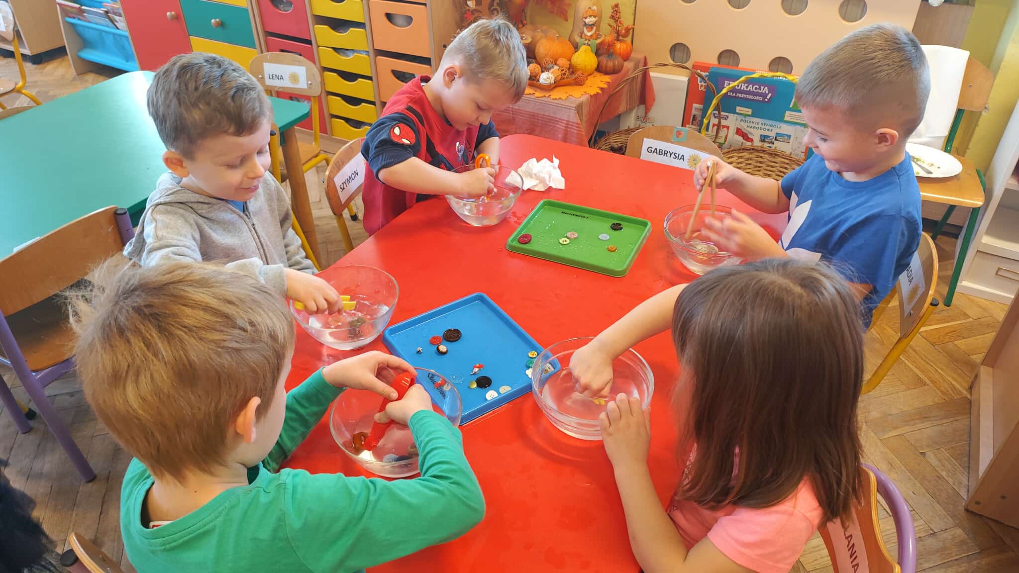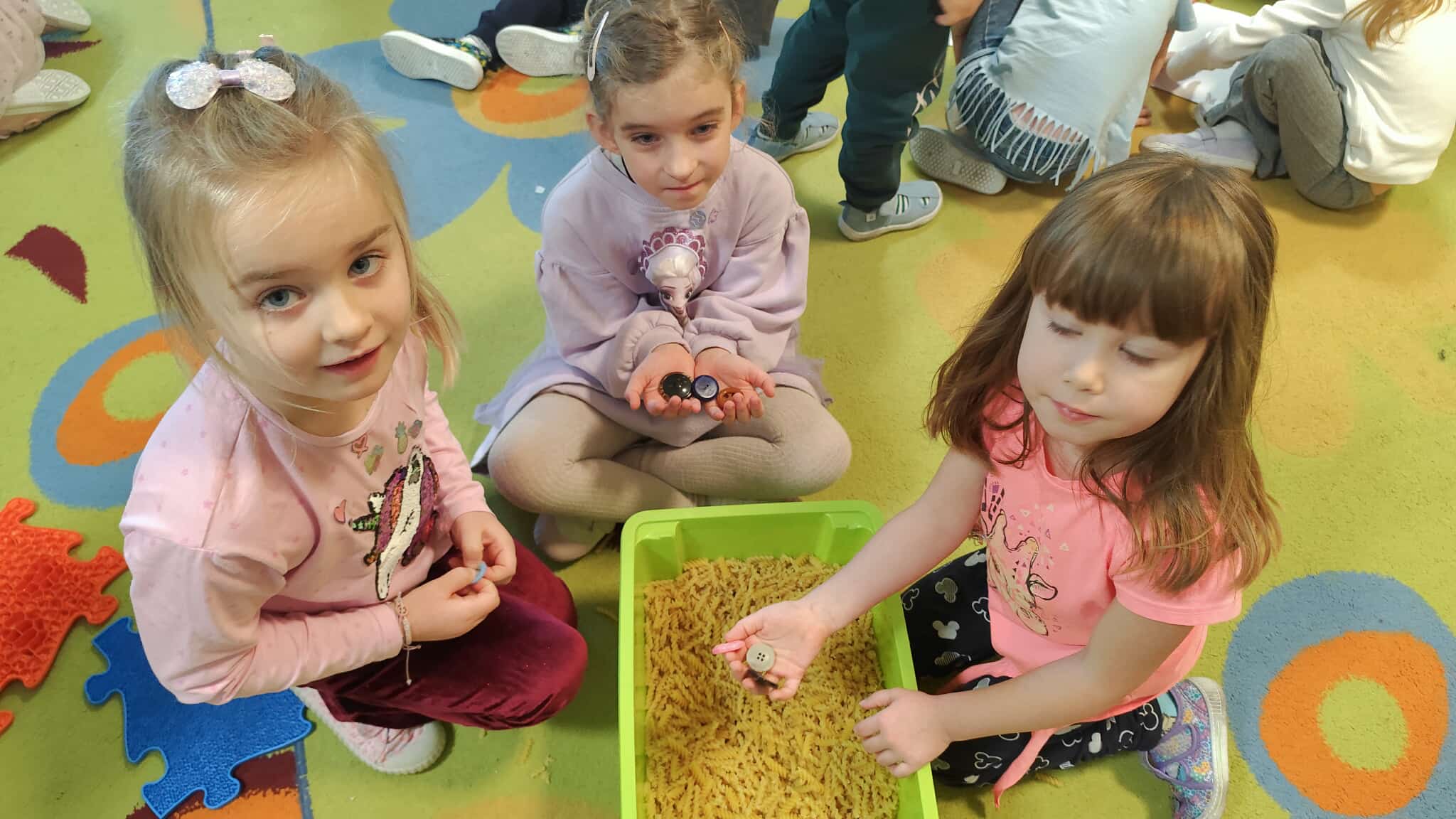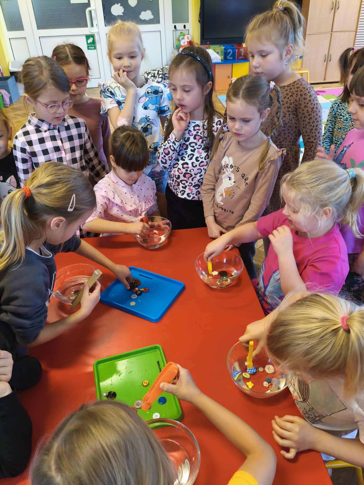 19 listopada odbył się w naszym przedszkolu Dzień Guzika. Była to świetna okazja do przeprowadzenia z dziećmi kreatywnych i niecodziennych aktywności oraz zabaw wspomagających motorykę małą i dużą, integrację sensoryczną, czy edukację matematyczną. Przedszkolaki poszukiwały guzików w materiałach sypkich (makaron, ryż), układały różnorodne wzory i przeliczały guziki w żelowych woreczkach, rzucały piłkami do celu, którym był ogromny guzik, uczestniczyły w wyścigach guzików oraz wyławiały guziki z wody. Ten dzień pokazał dzieciom, że nawet tak niepozorna rzecz jak guzik, może stać się podstawą wspaniale i kreatywnie spędzonego czasu.