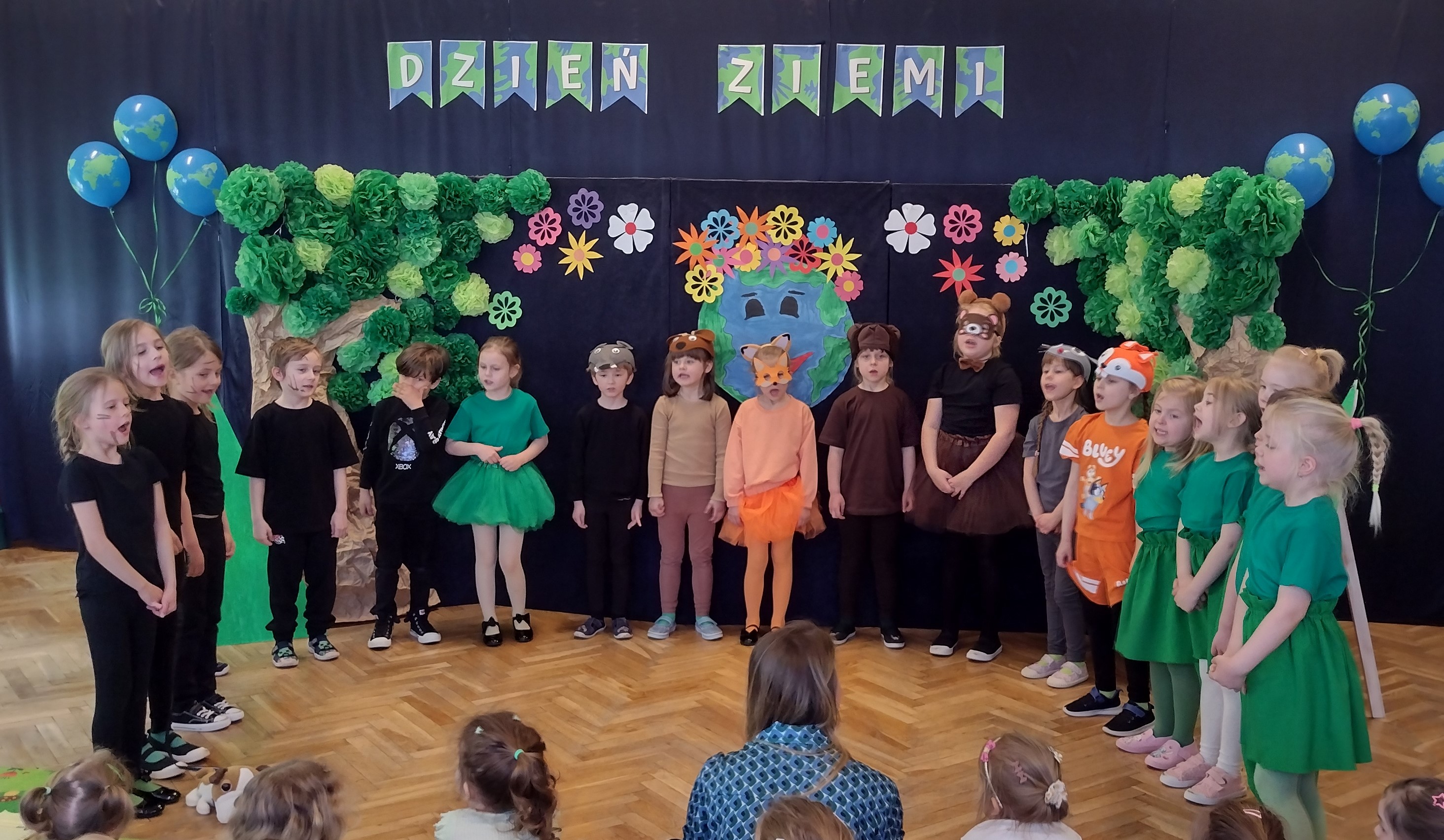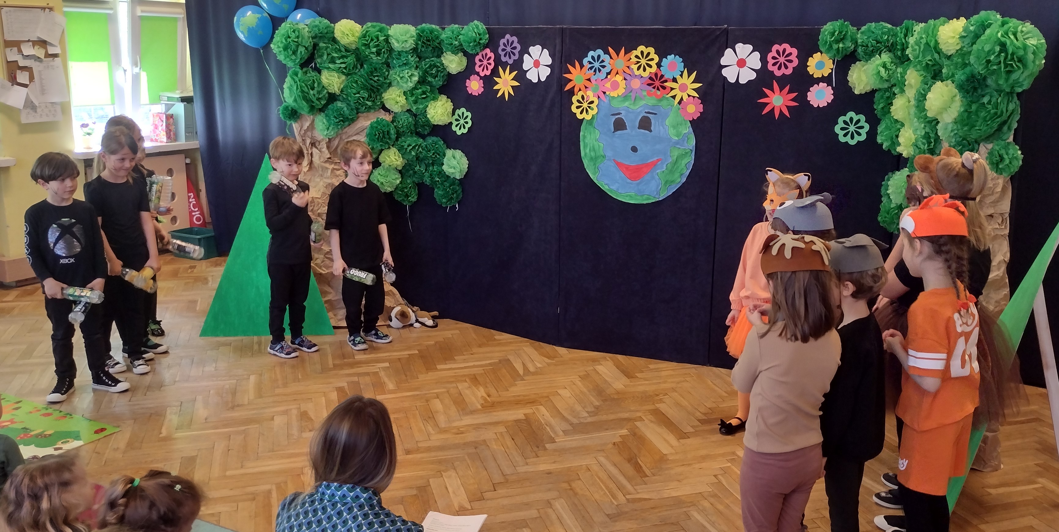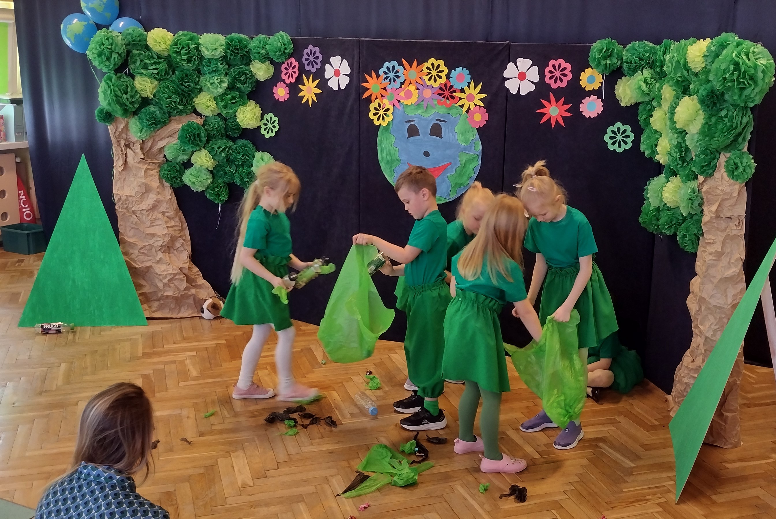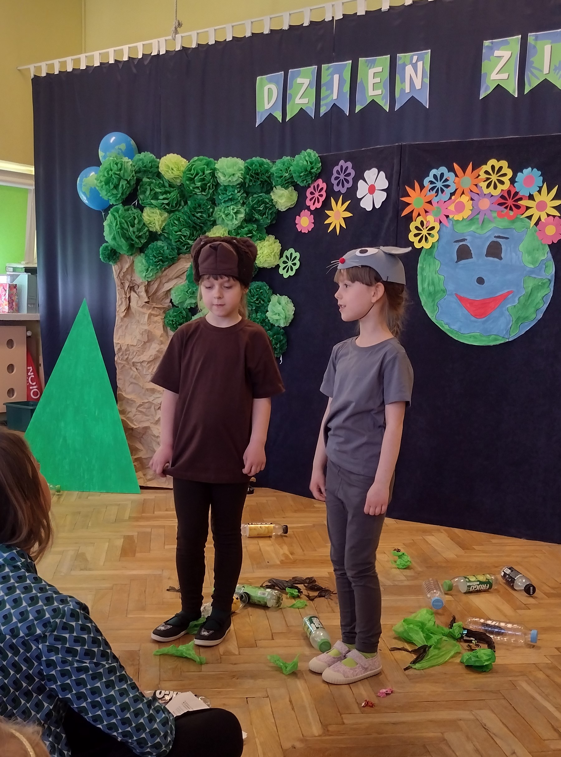 24 kwietnia odbył się w naszym przedszkolu Dzień Ziemi. Grupa starszaków swoim występem zabrała dzieci w podróż po lesie, w którym wśród żyjących tam zwierząt i leśnych skrzatów, pojawili się wandale. Przedstawienie było doskonałą okazją do ukazania dzieciom zagrożeń, jakie może nieść ze sobą niewłaściwe zachowanie ludzi względem otaczającej ich przyrody.