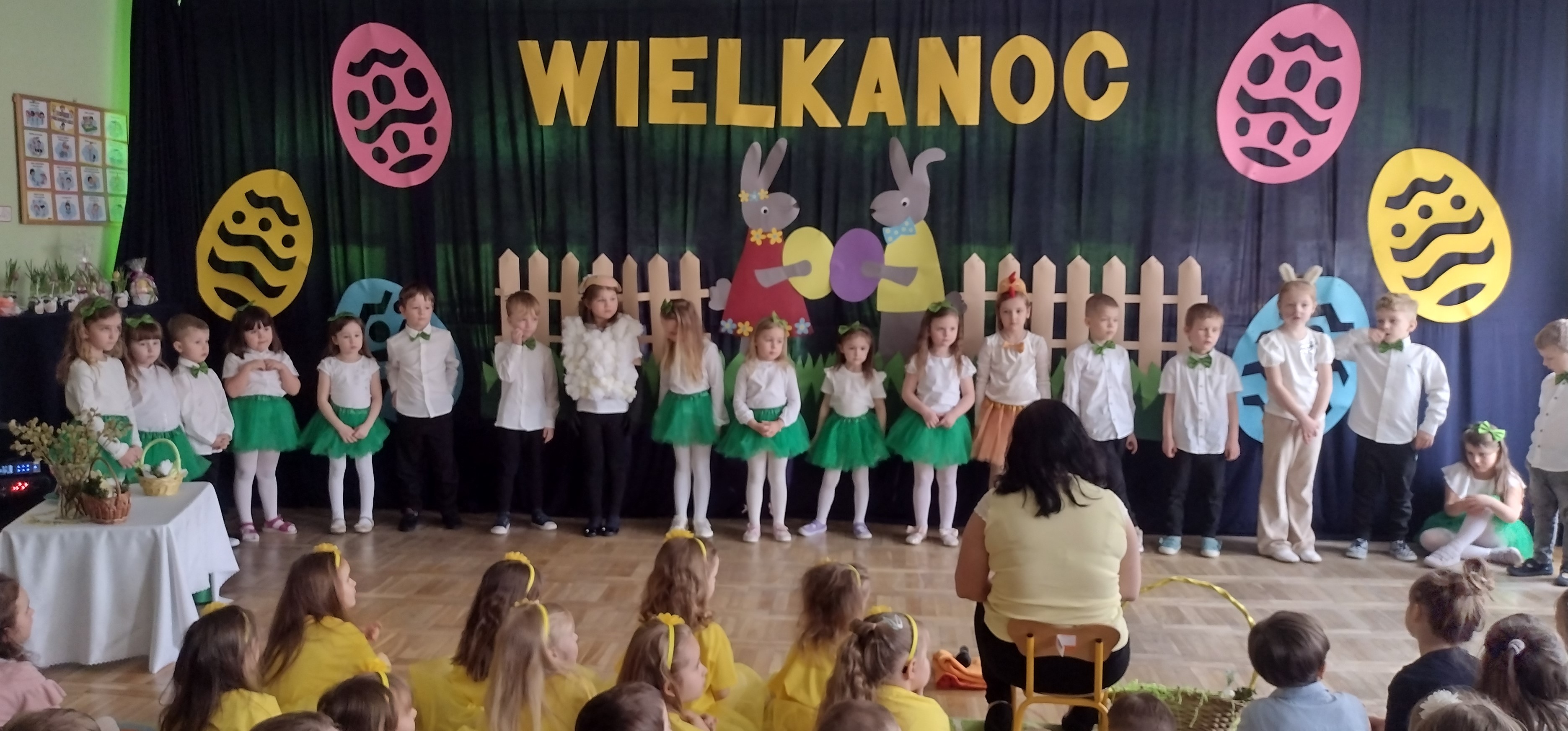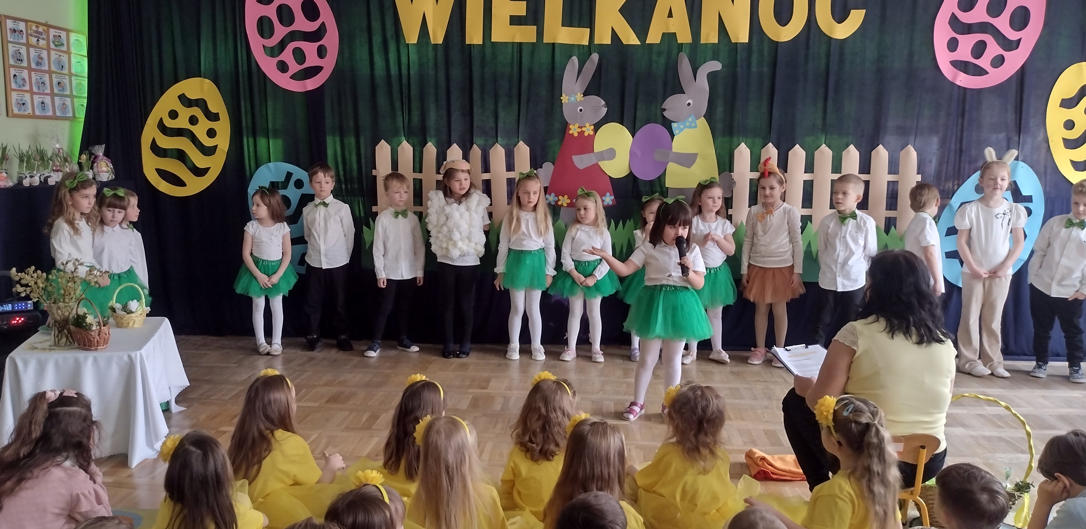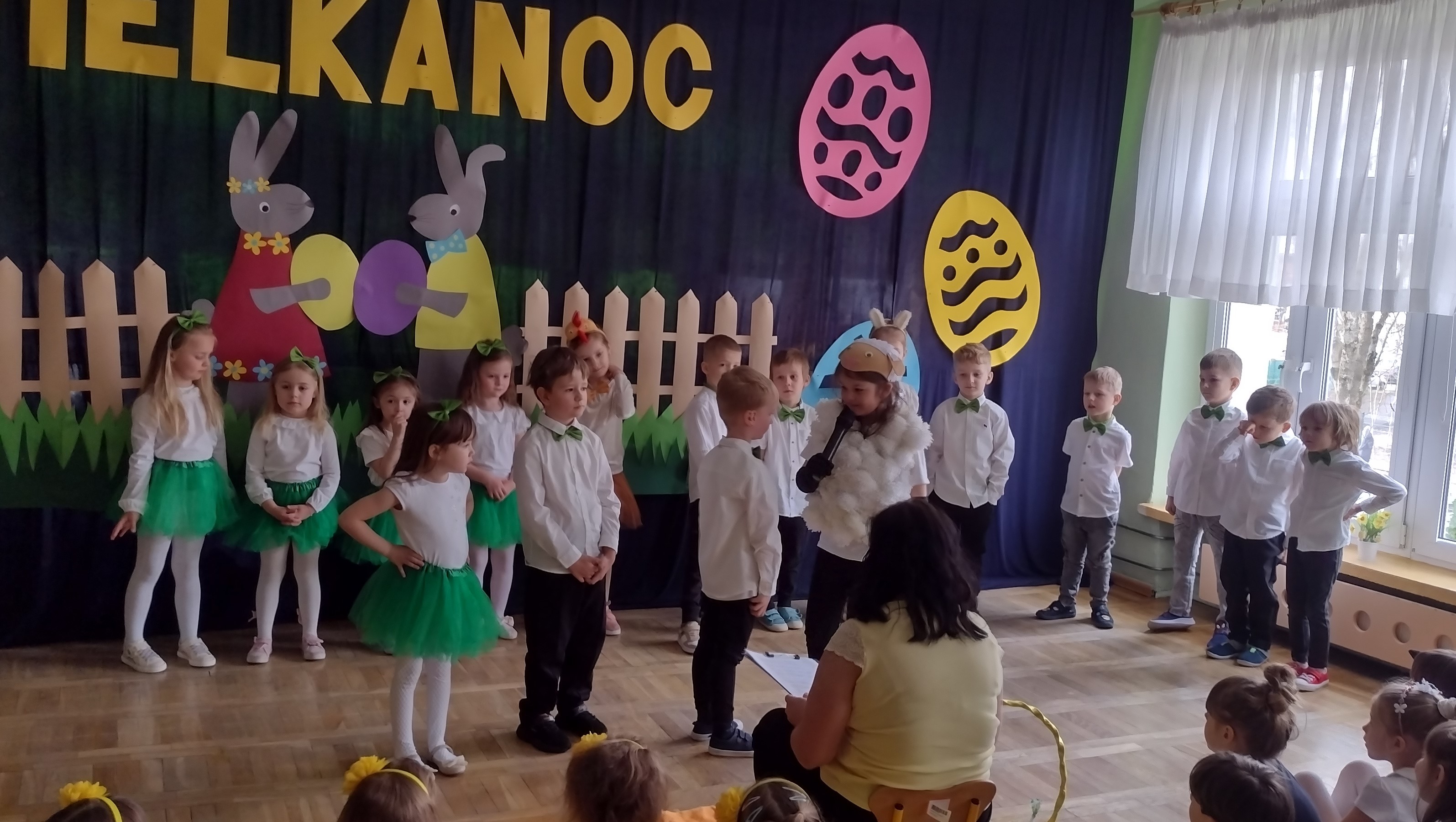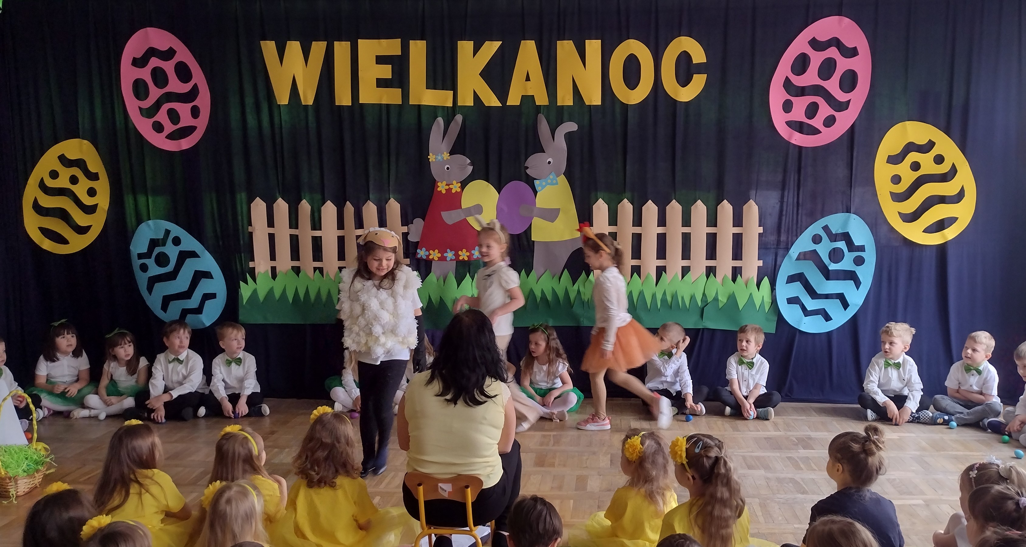 "Chcecie bajki? Będzie bajka. Malowała kurka jajka. Te w paseczki, tamte w kwiatki, te niebieskie jak bławatki....". Wielkimi krokami zbliżają się do nas Święta Wielkiej Nocy. Również w naszym przedszkolu widać mnóstwo świątecznych akcentów- wazony z bazimi kotkami i forsycjami, postacie wielkanocnych zajączków,czy wielkanocne koszyczki naszych przedszkolaków. Nie zabrakło także przedstawienia, na którym pojawili się zaproszeni goście: wiceprezydent miasta Bełchatowa pani Agnieszka Ludwiczak-Maszewska, przedstawiciel Komendy Powiatowej Policji w Bełchatowie, pani bibliotekarka z Miejskiej i Powiatowej Biblioteki Publicznej w Bełchatowie oraz przedstawiciele Rady Rodziców. Na scenie pojawiła się grupa "Biedronek" oraz "Misiów". Dzieci zaśpiewały, zatańczyły i opowiedziały o najważniejszych tradycjach związanych ze Świętami Wielkiej Nocy. Tak wspaniałym akcentem możemy rozpocząć czas oczekiwania na Wielkanocne Święta.