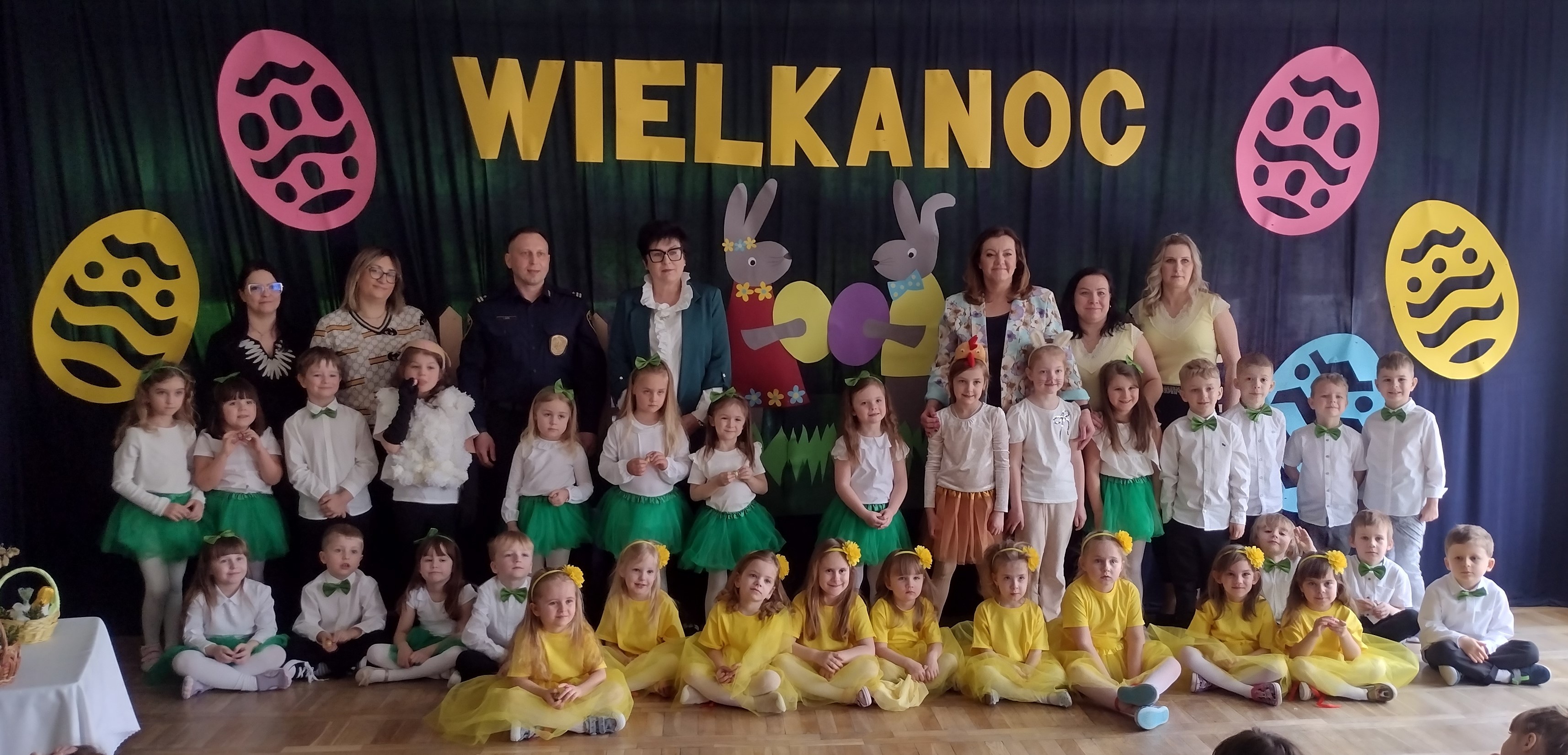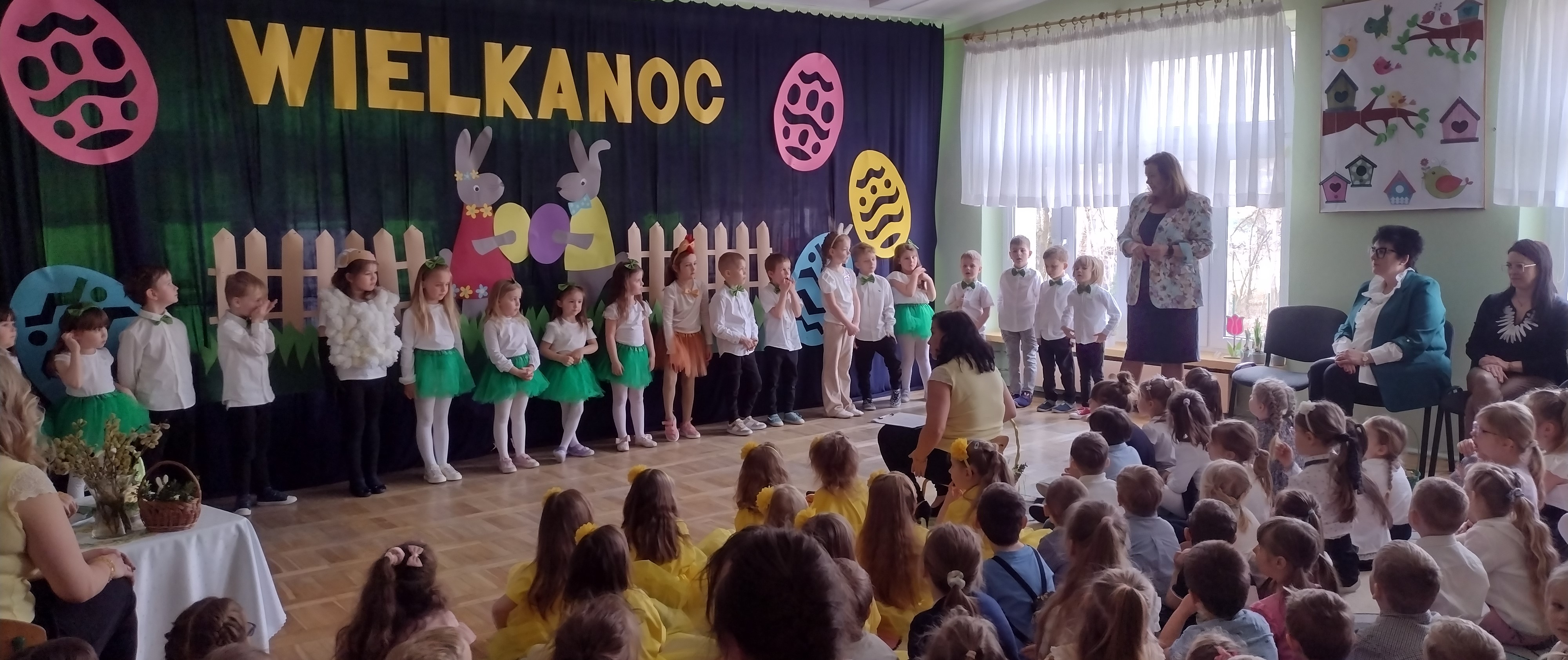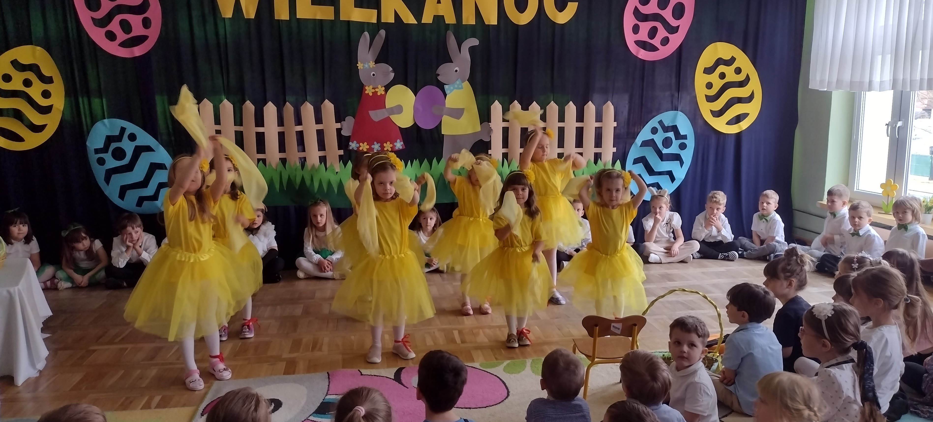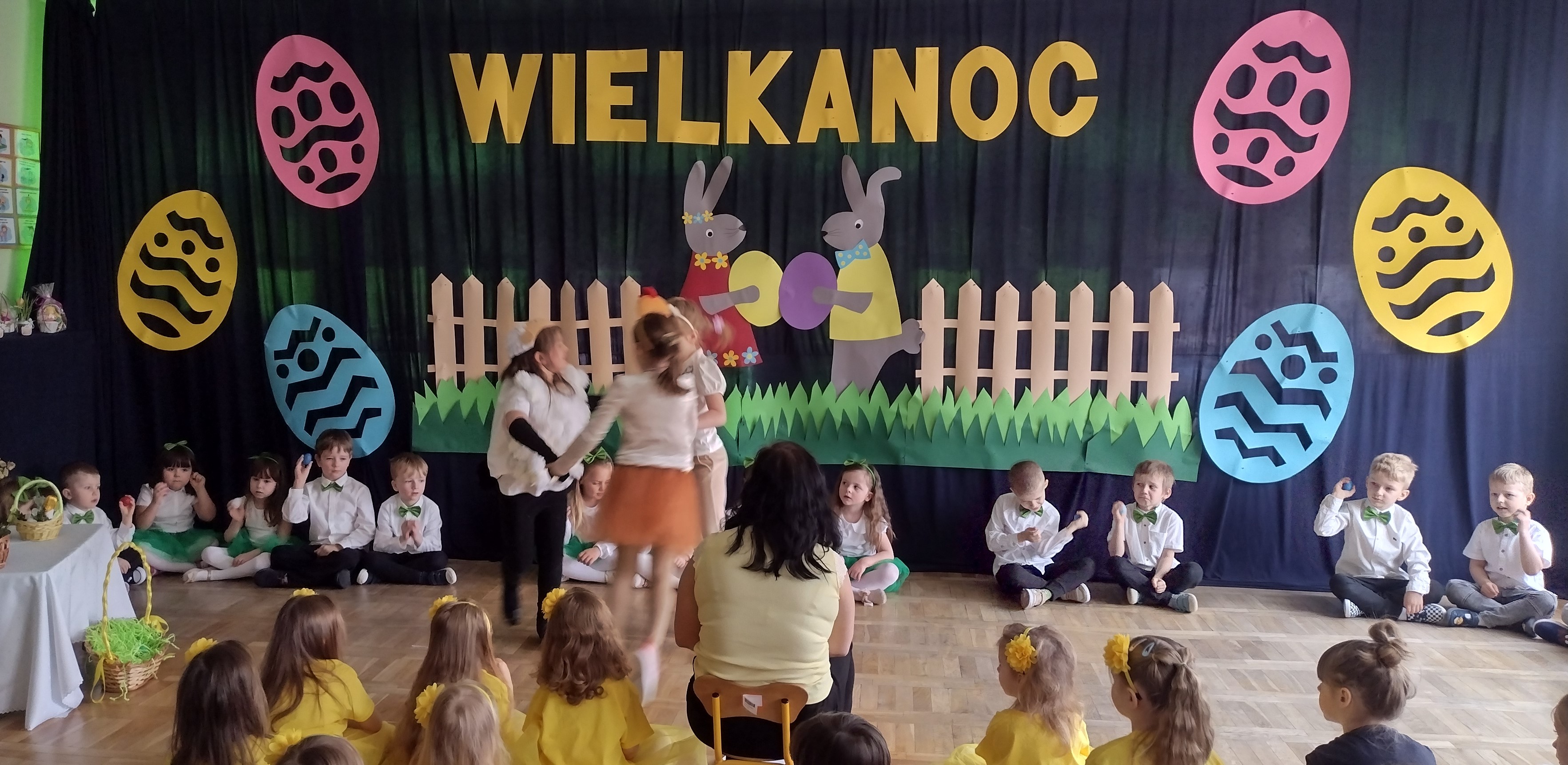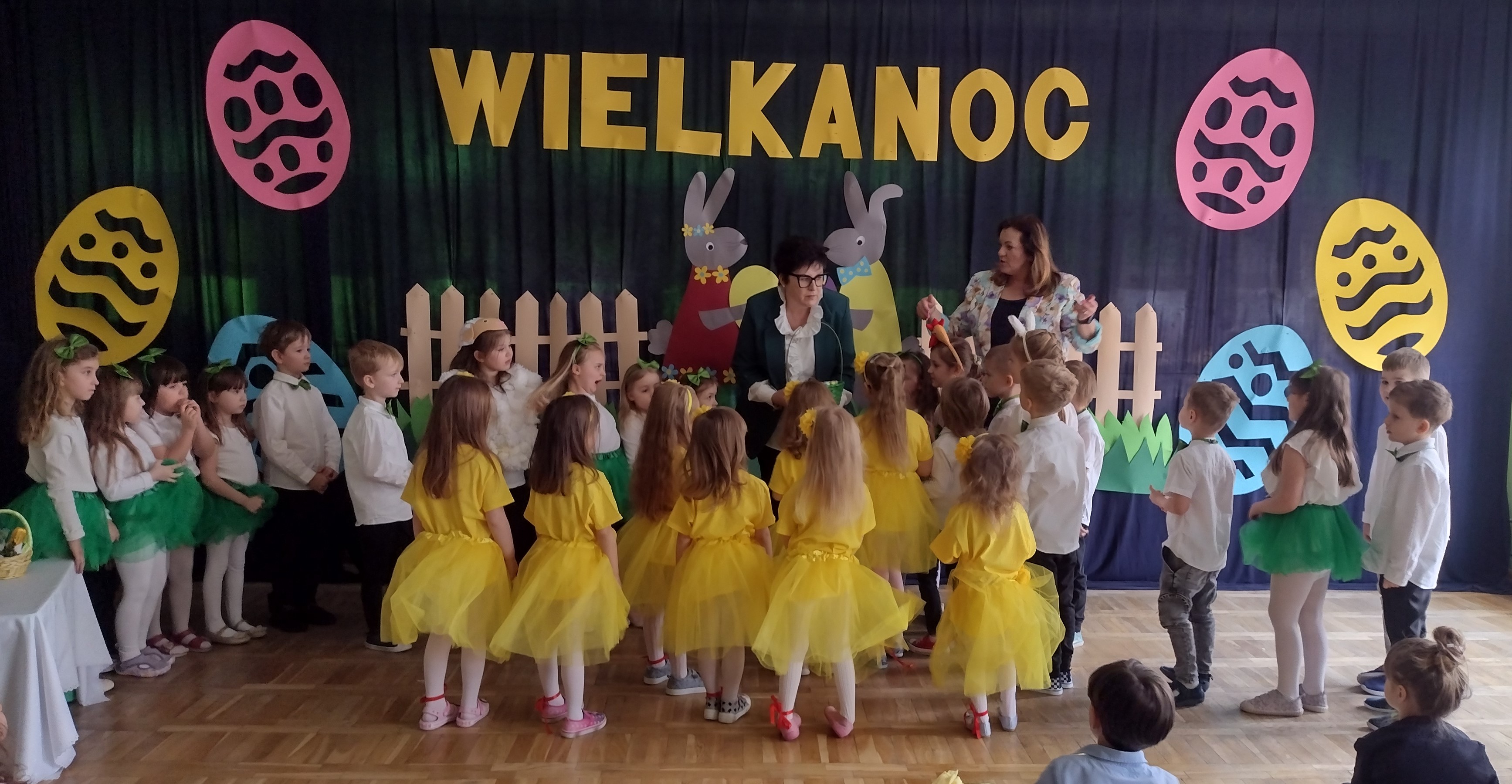 "Chcecie bajki? Będzie bajka. Malowała kurka jajka. Te w paseczki, tamte w kwiatki, te niebieskie jak bławatki....". Wielkimi krokami zbliżają się do nas Święta Wielkiej Nocy. Również w naszym przedszkolu widać mnóstwo świątecznych akcentów- wazony z bazimi kotkami i forsycjami, postacie wielkanocnych zajączków,czy wielkanocne koszyczki naszych przedszkolaków. Nie zabrakło także przedstawienia, na którym pojawili się zaproszeni goście: wiceprezydent miasta Bełchatowa pani Agnieszka Ludwiczak-Maszewska, przedstawiciel Komendy Powiatowej Policji w Bełchatowie, pani bibliotekarka z Miejskiej i Powiatowej Biblioteki Publicznej w Bełchatowie oraz przedstawiciele Rady Rodziców. Na scenie pojawiła się grupa "Biedronek" oraz "Misiów". Dzieci zaśpiewały, zatańczyły i opowiedziały o najważniejszych tradycjach związanych ze Świętami Wielkiej Nocy. Tak wspaniałym akcentem możemy rozpocząć czas oczekiwania na Wielkanocne Święta.